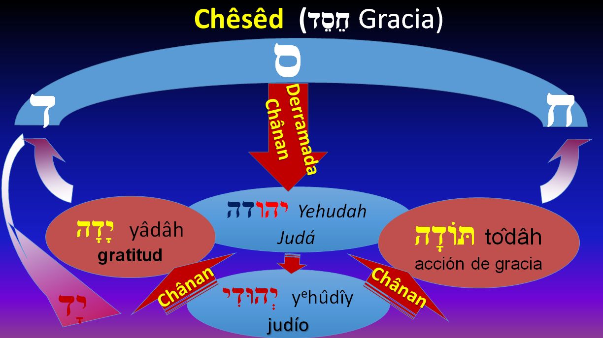 ¿Qué es Gracia en hebreo? Es JESED ( חסד ). JESED es Gracia DE DIOS. Pero ¿Qué quiere decir esto? En hebreo las letras y palabras hablan por si mismos y de muchas cosas. Por ejemplo, la primera letra ( ח ) , aquí está diciendo que la Gracia viene de Dios. Y esta segunda letra ( ס ) expresa que es universal, o sea, es para todos. Y el tercera letra ( ד ) es por donde la Gracia es manifestada por Dios, o sea, es la puerta para el hombre que desea recibir y experimentar. Esto significa que viene a través de Jesús. Viene desde Dios, ofrecida para todos, Por medio de Jesús.
